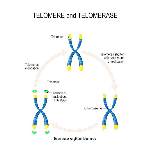 Однако каждый раз, когда клетка делится, теломеры постепенно становятся короче. Когда это укорачивание достигает своего предела, клетка больше не может делиться, и происходят такие явления, как «клеточное старение» или «естественная смерть (апоптоз)».